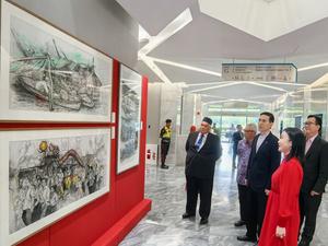 (250928) -- BANDAR SERI BEGAWAN, 28 septiembre, 2025 (Xinhua) -- Imagen del 27 de septiembre de 2025 del embajador de China en Brunéi, Xiao Jianguo (3-d) visitando una exposición de caligrafía tradicional y pintura junto a los invitados durante el Festival de Arte y Cultura Visual Brunéi-China 2025 llevado a cabo cerca de Bandar Seri Begawan, en Brunéi. El Festival de Arte y Cultura Visual Brunéi-China 2025 se lleva a cabo el sábado y domingo cerca de la capital Bandar Seri Begawan para celebrar la amistad y el intercambio cultural entre ambos países. El evento incluye una exposición de caligrafía y pintura y una exposición de arte Brunéi-China. (Xinhua/Embajada de China en Brunéi) (rtg) (ah)