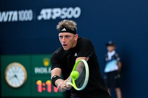 (250928) -- BEIJING, 28 septiembre, 2025 (Xinhua) -- Alejandro Davidovich Fokina devuelve la pelota durante el partido de segunda ronda de individuales masculinos entre Daniil Medvedev, de Rusia, y Alejandro Davidovich Fokina, de España, en el torneo de tenis China Open 2025, en Beijing, China, el 28 de septiembre de 2025. (Xinhua/Xi Mengchen) (rtg) (ah)
