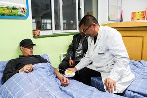 (250928) -- LONGXI, 28 septiembre, 2025 (Xinhua) -- Imagen del 27 de septiembre de 2025 de un trabajador médico midiendo la presión sanguínea de un residente afectado por el sismo, en un albergue temporal, en la aldea de Xianjiamen, en el poblado de Wenfeng del distrito de Longxi, en la provincia de Gansu, en el noroeste de China. Un sismo de magnitud 5,6 sacudió el distrito de Longxi, en la ciudad de Dingxi, a las 05:49 del sábado. Tras el terremoto, las fuerzas de rescate, incluidos bomberos, policías y médicos, realizaron labores de socorro en las zonas afectadas por el terremoto. (Xinhua/Lang Bingbing) (rtg) (ah)