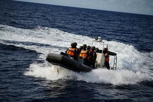 (250925) -- MAR MERIDIONAL DE CHINA, 25 septiembre, 2025 (Xinhua) -- Imagen del 4 de septiembre de 2025 de agentes del orden del buque Chigua de la Guardia Costera de China (GCCh) realizando una misión de aplicación de la ley en el Mar Meridional de China. Formaciones de buques del V Buró de la GCCh recientemente realizaron patrullajes policiales en aguas cercanas a Ren'ai Jiao de China. Las actividades de aplicación de la ley de la GCCh han mantenido la seguridad marítima y salvaguardado la soberanía territorial y los derechos e intereses marítimos de China en la región. (Xinhua/Xu Hongyan) (rtg) (ra) (vf)