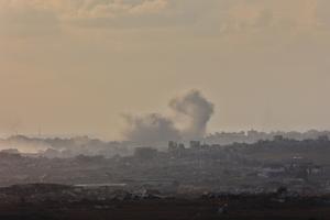 (250925) -- JERUSALEN, 25 septiembre, 2025 (Xinhua) -- Humo se eleva de edificios dañados en la Ciudad de Gaza visto desde el sur de la frontera israelí, el 25 de septiembre de 2025. (Xinhua/Gil Cohen Magen) (rtg) (ra) (ce)