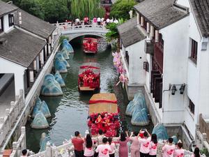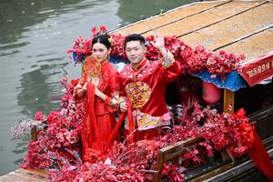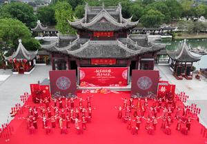 (250929) -- SUZHOU, 29 septiembre, 2025 (Xinhua) -- Parejas participan en una boda colectiva, en el antiguo poblado de Luzhi,...