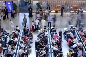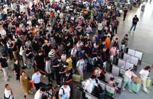 (250929) -- BEIJING, 29 septiembre, 2025 (Xinhua) -- Pasajeros se forman para registrar sus boletos, en la Estación de Ferrocarriles...
