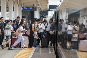 (250929) -- BEIJING, 29 septiembre, 2025 (Xinhua) -- Pasajeros abordan un tren en la Estación de Ferrocarriles de Jinhua, en...