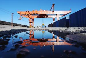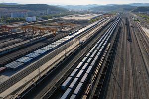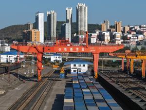 (250927) -- SUIFENHE, 27 septiembre, 2025 (Xinhua) -- Una grúa pórtico realiza operaciones de transbordo en un tren de carga...