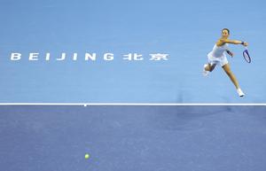 (250927) -- BEIJING, 27 septiembre, 2025 (Xinhua) -- Zheng Qinwen devuelve la pelota durante el partido de segunda ronda de...