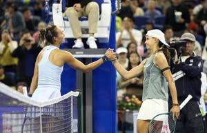 (250927) -- BEIJING, 27 septiembre, 2025 (Xinhua) -- Zheng Qinwen (i) saluda a Emiliana Arango al término del partido de...
