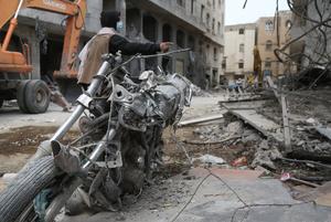(250926) -- SANA, 26 septiembre, 2025 (Xinhua) -- Un hombre camina junto a una motocicleta dañada en ataques aéreos israelíes,...
