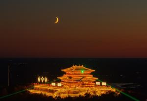 (250926) -- HARBIN, 26 septiembre, 2025 (Xinhua) -- Vista aérea tomada con un dron del Pabellón Dongji y la luna...