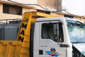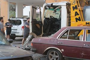 (250929) -- NABATIEH, 29 septiembre, 2025 (Xinhua) -- Imagen del 29 de septiembre de 2025 de un camión cisterna golpeado...