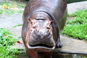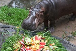 (250908) -- CHONBURI, 8 septiembre, 2025 (Xinhua) -- Mae Mali, un hipopótamo hembra, festeja su 60 cumpleaños en el Zoológico...