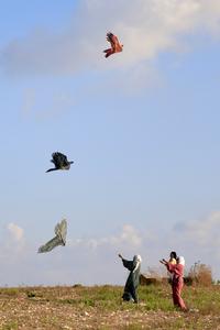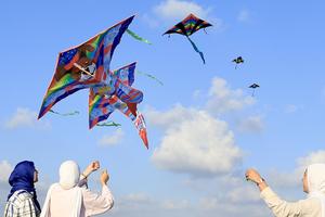 (250908) -- ZRARIEH, 8 septiembre, 2025 (Xinhua) -- Imagen del 7 de septiembre de 2025 de personas volando cometas durante...