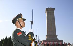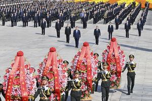 (250930) -- BEIJING, 30 septiembre, 2025 (Xinhua) -- Xi Jinping camina alrededor del Monumento a los Héroes del Pueblo para...