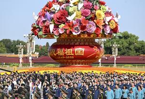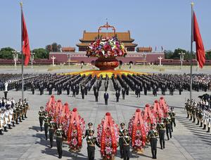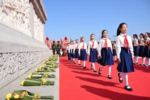 (250930) -- BEIJING, 30 septiembre, 2025 (Xinhua) -- Una ceremonia para ofrendar cestas de flores a los héroes nacionales caídos...