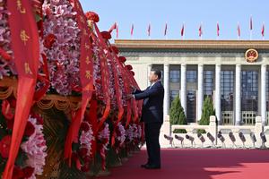 (250930) -- BEIJING, 30 septiembre, 2025 (Xinhua) -- Xi Jinping endereza la cinta de una cesta de flores durante una...