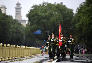 (251001) -- BEIJING, 1 octubre, 2025 (Xinhua) -- Una ceremonia de izamiento de la bandera se lleva a cabo en...