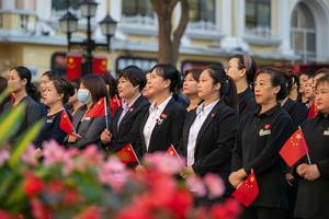 (251001) -- BEIJING, 1 octubre, 2025 (Xinhua) -- Personas asisten a una ceremonia de izamiento de la bandera, en Harbin,...
