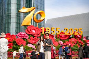 (251001) -- BEIJING, 1 octubre, 2025 (Xinhua) -- Turistas se toman fotografías frente a un conjunto de instalaciones florales para...