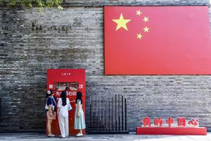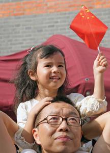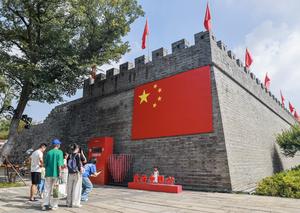 (251001) -- BEIJING, 1 octubre, 2025 (Xinhua) -- Una niña se toma fotografías con la bandera nacional en una antigua...