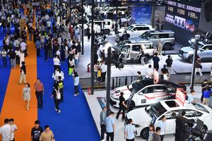 (251001) -- CHANGSHA, 1 octubre, 2025 (Xinhua) -- Visitantes observan automóviles exhibidos en un evento de promoción de consumo de...