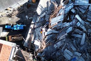 (251002) -- SIDOARJO, 2 octubre, 2025 (Xinhua) -- Vista aérea tomada con un dron de rescatistas trabajando con una grúa...
