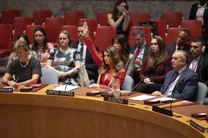(250918) -- NACIONES UNIDAS, 18 septiembre, 2025 (Xinhua) -- La enviada especial presidencial adjunta de Estados Unidos para Oriente Medio, Morgan Ortagus (i-frente), vota en contra de un proyecto de resolución durante una reunión del Consejo de Seguridad de la ONU, en la sede de la ONU, en Nueva York, el 18 de septiembre de 2025. Estados Unidos vetó el jueves un proyecto de resolución del Consejo de Seguridad de la ONU que hubiera exigido a Israel levantar de inmediato todas las restricciones impuestas al acceso y la entrega de la ayuda humanitaria a Gaza. (Xinhua/Xie E) (jg) (ah) (ce)