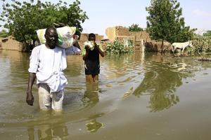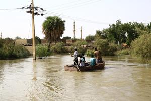 (251002) -- BAHRI, 2 octubre, 2025 (Xinhua) -- Imagen del 1 de octubre de 2025 de residentes vadeando a través...