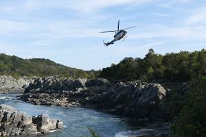 (251004) -- FAIRFAX, 4 octubre, 2025 (Xinhua) -- Imagen del 3 de octubre de 2025 de un helicóptero de la Policía de Parques de Estados Unidos sobrevolando el Parque Great Falls que permanece cerrado debido al cierre del Gobierno, en el condado de Fairfax, Virginia, Estados Unidos. Senadores demócratas de Estados Unidos bloquearon el viernes una iniciativa republicana para financiar temporalmente al Gobierno, lo que significa que es probable que el cierre del Gobierno se prolongue durante el fin de semana. (Xinhua/Li Rui) (jg) (rtg) (ce)