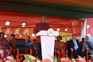 (251005) -- ACRA, 5 octubre, 2025 (Xinhua) -- Imagen del 4 de octubre de 2025 del presidente de Ghana, John Dramani Mahama, hablando durante una ceremonia de colocación de primera piedra para el comienzo del Parque de Atracciones Internacional Bright, en Afienya, en la Región de Gran Acra, en Ghana. Una ceremonia de colocación de la primera piedra de un parque de atracciones ultramoderno construido por Greenhouse International Development Group, una empresa china, se celebró el sábado en Afienya, cerca de la ciudad portuaria de Tema, en Ghana. (Xinhua/Seth) (rtg) (ah)