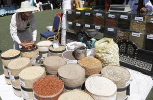 (251006) -- SANA, 6 octubre, 2025 (Xinhua) -- Un vendedor de cereales prepara los granos para su venta durante el...