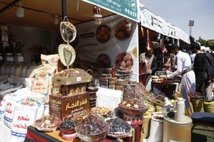(251006) -- SANA, 6 octubre, 2025 (Xinhua) -- Personas compran dátiles durante el Festival de las Recompensas de Yemen, en...
