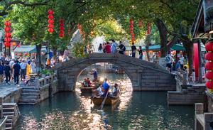 (251006) -- BEIJING, 6 octubre, 2025 (Xinhua) -- Imagen tomada con un dron el 6 de octubre de 2025 de turistas a bordo de un bote en un área escénica, en Suzhou, en la provincia de Jiangsu, en el este de China. A medida que convergen las vacaciones por el Día Nacional de China y el Festival del Medio Otoño, las actividades culturales, las activas redes de transporte y las innovadoras escenas de consumo del país están pintando un panorama vívido de resiliencia económica y potencial de crecimiento. (Xinhua/Zhou Shegen) (rtg) (ah) (vf)
