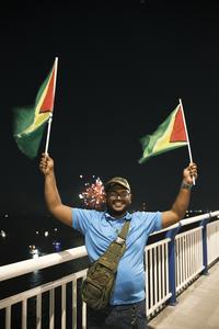 (251006) -- GEORGETOWN, 6 octubre, 2025 (Xinhua) -- Imagen del 5 de octubre de 2025 de un hombre sosteniendo banderas...