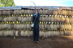 (251006) -- SUKABUMI, 6 octubre, 2025 (Xinhua) -- Imagen del 5 de octubre de 2025 de un hombre atando hojas...