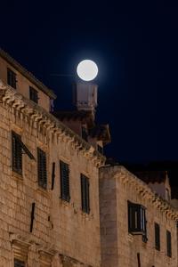 (251006) -- ZAGREB, 6 octubre, 2025 (Xinhua) -- La luna llena se eleva sobre el poblado antiguo de Dubrovnik, Croacia,...