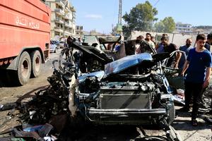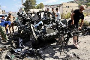 (251006) -- NABATIEH, 6 octubre, 2025 (Xinhua) -- Personas inspeccionan los restos de un vehículo atacado por misiles disparados por...