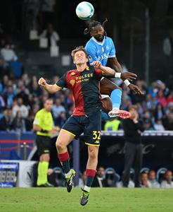 (251006) -- NAPOLES, 6 octubre, 2025 (Xinhua) -- Imagen del 5 de octubre de 2025 de Frank Anguissa (d), de...