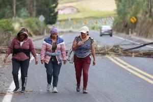 (251006) -- IMBABURA, 6 octubre, 2025 (Xinhua) -- Mujeres caminan por una carretera bloqueada debido al paro nacional, en el...