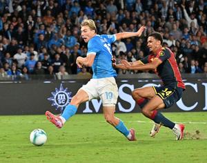 (251006) -- NAPOLES, 6 octubre, 2025 (Xinhua) -- Imagen del 5 de octubre de 2025 de Rasmus Hojlund (i), de...