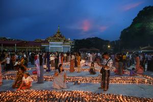 (251006) -- YANGON, 6 octubre, 2025 (Xinhua) -- Personas encienden velas durante el día de luna llena del Festival Thadingyut,...