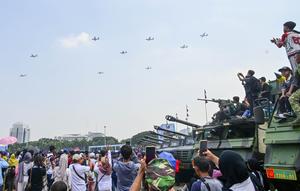 (251006) -- YAKARTA, 6 octubre, 2025 (Xinhua) -- Imagen del 5 de octubre de 2025 personas observando el desfile militar...