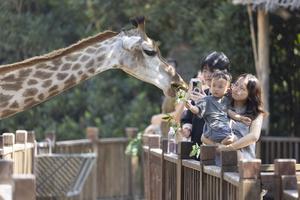 (251006) -- BEIJING, 6 octubre, 2025 (Xinhua) -- Un niño interactúa con una jirafa en un zoológico, en Shanghai, en...