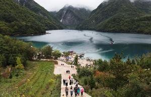 (251006) -- BEIJING, 6 octubre, 2025 (Xinhua) -- Turistas visitan el punto escénico del lago Tianchi, en el distrito de...