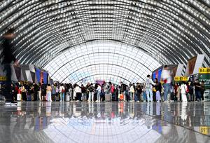 (251007) -- BEIJING, 7 octubre, 2025 (Xinhua) -- Pasajeros son vistos en la sala de espera de la Estación del...