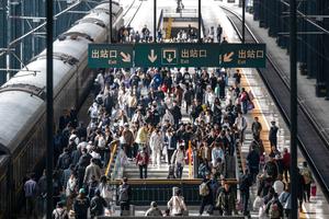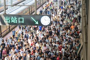 (251007) -- BEIJING, 7 octubre, 2025 (Xinhua) -- Pasajeros esperan para abordar un tren en la Estación del Ferrocarril Longmen...