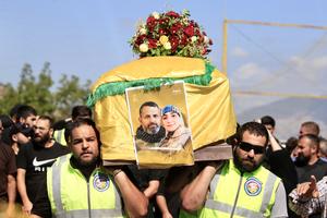(251007) -- KFARKELA, 7 octubre, 2025 (Xinhua) -- Libaneses asisten al funeral de un miembro de Hizbulá y su esposa,...