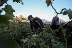 (251008) -- GAZA, 8 octubre, 2025 (Xinhua) -- Un agricultor palestino cosecha berenjenas en una granja, en Deir al-Balah, en...