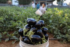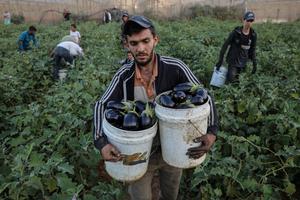 (251008) -- GAZA, 8 octubre, 2025 (Xinhua) -- Agricultores palestinos cosechan berenjenas en una granja, en Deir al-Balah, en el...