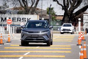 (251008) -- BUENOS AIRES, 8 octubre, 2025 (Xinhua) -- Asistentes realizan una prueba de conducción del modelo Yuan Pro de...