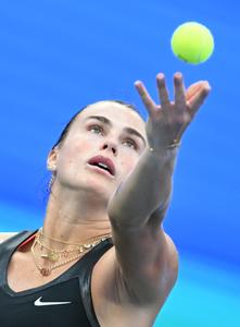 (251008) -- WUHAN, 8 octubre, 2025 (Xinhua) -- Aryna Sabalenka, de Bielorrusia, sirve la pelota durante el partido de dieciseisavos de final de individuales femeninos ante Rebecca Sramkova, de Eslovaquia, en el torneo de tenis Wuhan Open 2025, en Wuhan, en la provincia de Hubei, en el centro de China, el 8 de octubre de 2025. (Xinhua/Cheng Min) (oa) (ah) (ra) (vf)